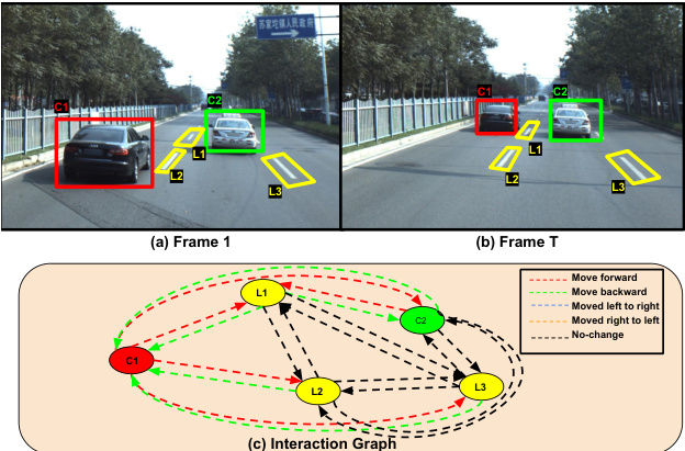 图 1: 图(a)和(b)展示了两个不同时间帧中的两辆汽车和三条车道标线。整个场景的演变过程被记录在交互图(c)中。我们提出的模型通过对此类交互图进行推理,从而对物体行为进行分类。在此场景中,左侧车辆正超越车道标线和右侧车辆。借助交互图(c),我们的模型可以预测左侧车辆正在超越右侧车辆。