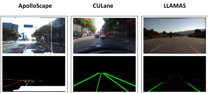 Figure 6. Typical video frames of ApolloS cape, CULane and LLAMAS datasets.