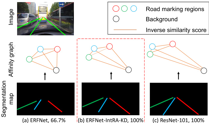 ResNet-101. It is interesting to see that those spatially close and visually similar road markings are pulled closer and those spatially distant and visually different markings are pulled apart in the feature space using IntRA-KD . An example is shown in Fig. 5, illustrating the effectiveness of IntRA-KD in transferring structural knowledge from the teacher model to the student model. We show in the experiment section that such transfers are essential to improve the performance of student models.