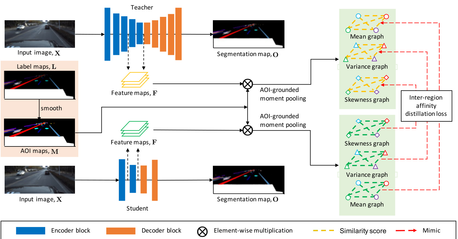 Since autonomous vehicles have limited computational resources and demand real-time performance, lightweight models are adopted to fulfil the aforementioned requirements. On account of limited parameter size as well as insufficient guidance due to sparse supervision signals, these small models usually fail in the challenging road marking segmentation task. Knowledge distillation [6, 8, 13] is a common approach to improving the performance of small models by means of distilling knowledge from large models. There are two networks in knowledge distillation, one is called the student and the other is called the teacher. The purpose of knowledge distillation is to transfer dark knowledge from the large, cumbersome teacher model to the small, compact student model. The dark knowledge can take on many forms, e.g., output logits and intermediate layer activation s. There exist previous distillation methods [15, 17, 23] that exploit the relationship between a batch of samples. These approaches, however, do not take into account the structural relationship between different areas within a sample.