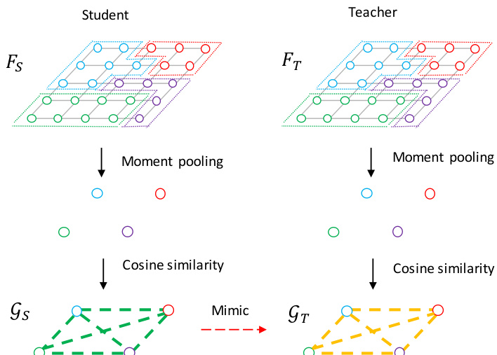Our method is known as Inter-Region Affinity Knowledge Distillation (IntRA-KD). As the name implies, knowledge on scene structure is represented as inter-region affinity graphs, as shown as Fig. 1. Each region is a part of a deep feature map, while each node in the graph denotes the feature distribution statistics of each region. Each pair of nodes are connected by an edge representing their similarity in terms of feature distribution. Given the same input image, the student network and the teacher network will both produce their corresponding affinity graph. Through graph matching, a distillation loss on graph consistency is generated to update the student network.
