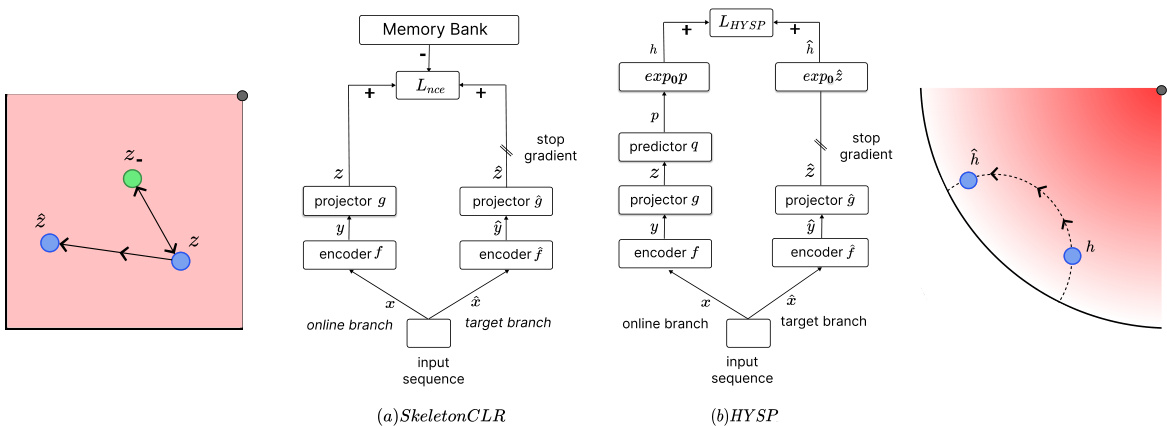 HYSP基于近期提出的自监督方法Skeleton CLR (Li et al., 2021) 进行骨架动作表征训练。该方法通过数据增强 (He et al., 2020; Chen et al., 2020a; Caron et al., 2020; Grill et al., 2020; Chen & He, 2021; Li et al., 2021) 为输入样本生成两个视图,随后使用连体网络处理这两个视图,分别生成在线表征和目标表征。训练过程中,前者需要匹配后者——二者作为同一样本的两个视图构成正样本对。HYSP在训练时仅考虑正样本,并需要课程学习机制。后者源于双曲嵌入初始化时因过度自信(高半径)导致的梯度消失现象 (Guo et al., 2022b),因此初始阶段仅考虑角度参数,这相当于从共形欧几里得优化开始训练。前者则是因为在双曲空间中匹配两个嵌入意味着需要同步匹配其不确定性,而不同样本的负样本对在这种设定下会形成不适定问题——不确定性本质上反映的是每个样本在训练各阶段的特异性。这种方法规避了对比学习所需的复杂且计算密集的负样本挖掘流程*。第3.2节将详细讨论这两个方面。