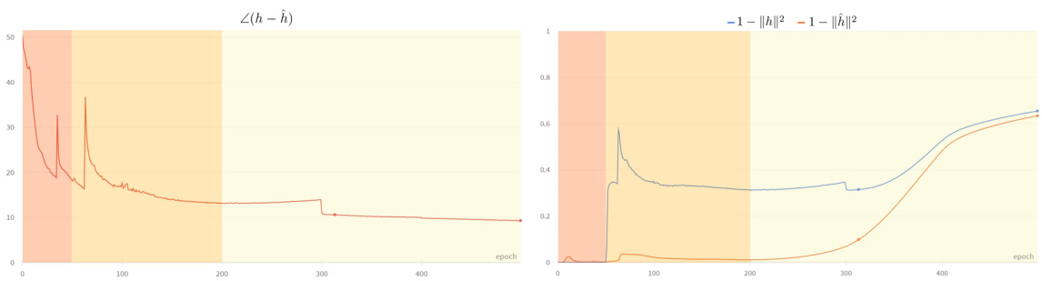 Learning is self-paced, because the gradient changes according to the certainty of the target $\hat{h}$ , i.e. the larger their radius $\lVert\hat{h}\rVert$ , the more certain $\hat{h}$ , and the stronger are the gradients $\nabla L_{p o i n}(h,\hat{h})$ , irrespective of $h$ . We further discuss the training dynamics of Eq. 5. Let us consider Fig. 2, plotting for each training epoch the angle difference between $h$ and $\hat{h}$ , namely $\angle(h-\hat{h})$ , and respectively the quantities $1-|h|^{2}$ and $1-\Vert\hat{h}\Vert^{2}$ :