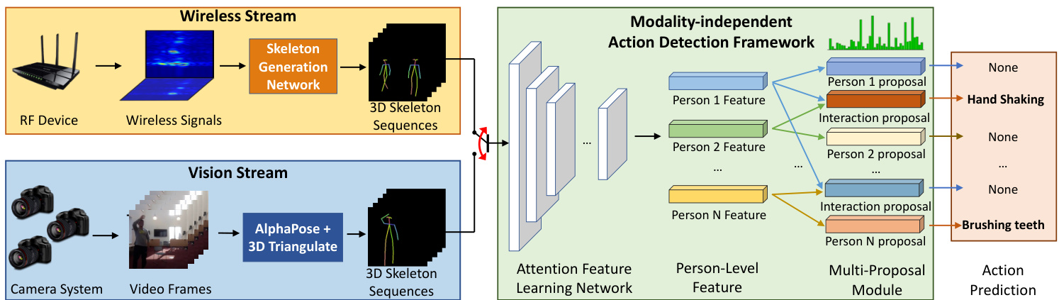 As shown in Figure 3, the Modality-Independent Action Recognition framework uses the 3D skeletons gener- ated from RF signals to perform action detection.