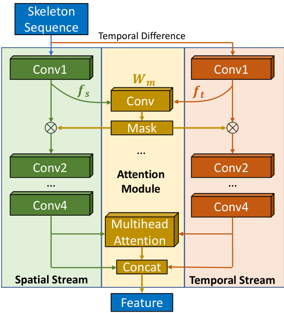 然后我们在潜在特征上应用 $M a s k$,如图 4 所示。通过这种方式,掩码可以学习为不同关节提供不同的权重,从而获得更好的动作识别性能。我们还在特征提取后的时间维度上添加了一个多头注意力模块 [34],以学习对不同时间戳的注意力。