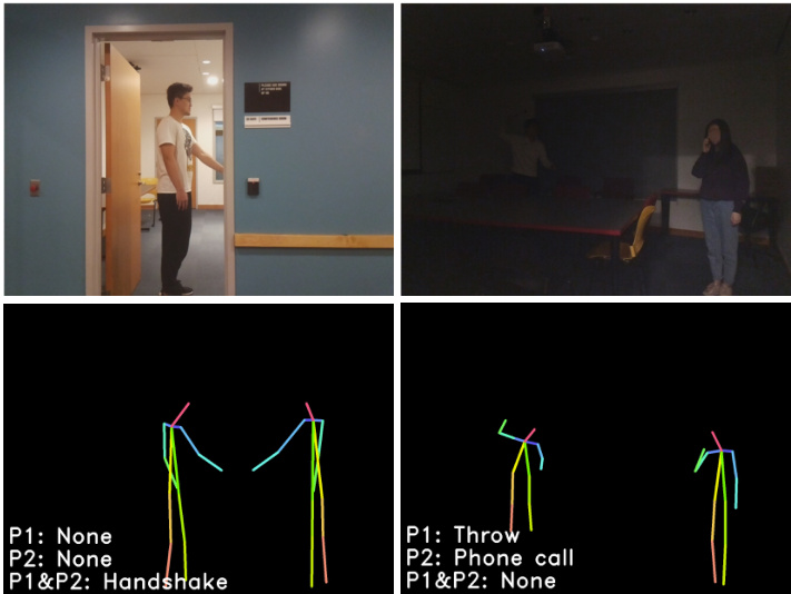 Figure 1: The figure shows two test cases of our system. On the left, two people are shaking hands, while one of them is behind the wall. On the right, a person is hiding the dark and throwing an object at another person who is making a phone call. The bottom row shows both the skeletal representation generated by our model and the action prediction.