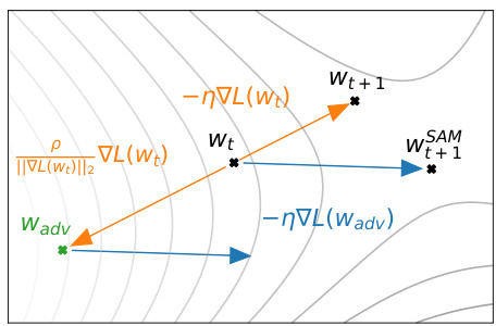 损失函数景观的几何特性(尤其是极小值的平坦度)与泛化能力之间的关联,已从理论和实证角度得到广泛研究(Shirish Keskar等,2016;Dziugaite & Roy,2017;Jiang等,2019)。尽管这种关联为开发具有更好泛化性能的模型训练方法提供了可能,但迄今为止,能够专门寻找更平坦极小值并有效提升各类前沿模型泛化能力的实用高效算法仍难以实现(例如参见Chaudhari等,2016;Izmailov等,2018;我们将在第5节详细讨论先前工作)。