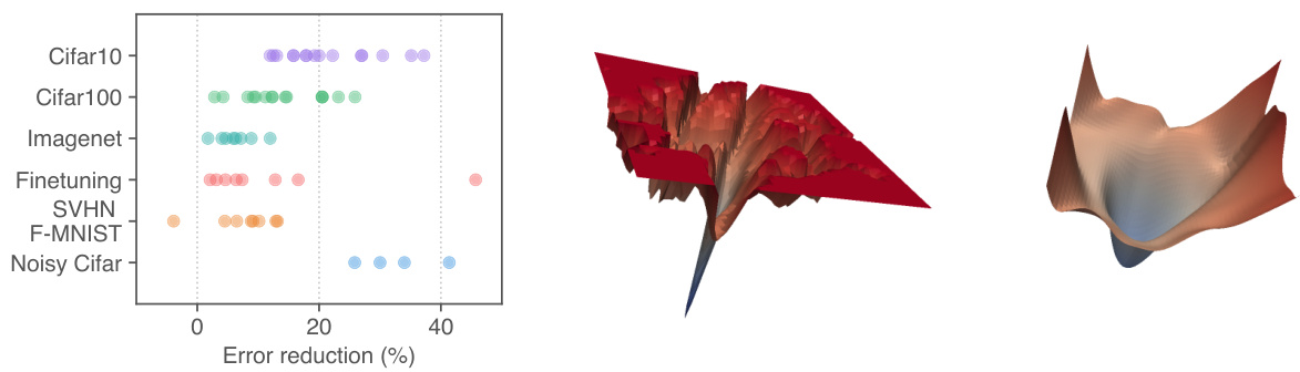 Figure 1: (left) Error rate reduction obtained by switching to SAM. Each point is a different dataset / model / data augmentation. (middle) A sharp minimum to which a ResNet trained with SGD converged. (right) A wide minimum to which the same ResNet trained with SAM converged.