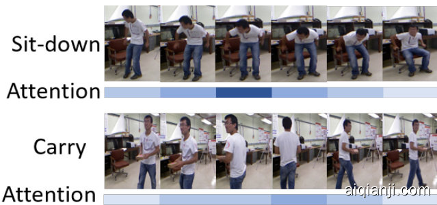 图 1: UT-Kinect数据集中两个活动(坐下和搬运)的示例(第一行)。第二行展示了使用HAMLET模型在对应RGB帧上的时序注意力权重。对于这些序列,HAMLET对坐下活动(上方)的第三个RGB图像片段和搬运活动(下方)的第四个RGB图像片段给予了更多关注。此处,较浅的颜色表示较低的注意力权重。