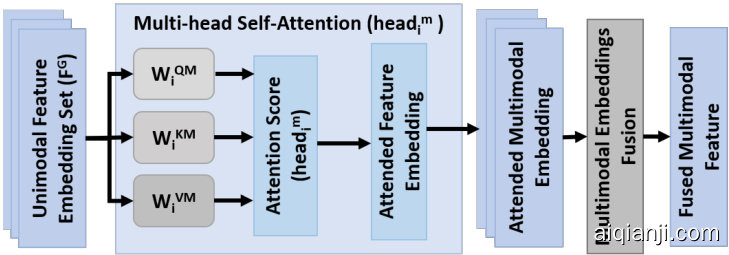 在本工作中,我们基于提出的多头自注意力模型MAT(Multimodal Attention based Feature Fusion)开发了一种新颖的多模态特征融合架构,如图3所示。通过模块化特征编码器对单模态特征进行编码后,我们将这些特征嵌入$F_{m}$组合成一个无序的多模态特征嵌入集$F^{G^{u}}=(F_{1},F_{2},...,F_{M})$,其尺寸为$(B\times M\times D^{H})$,其中$M$表示模态总数。随后,我们将单模态特征表示集$F^{G^{u}}$输入MAT模型,生成经过注意力加权的融合多模态特征表示$F^{G^{a}}$。
