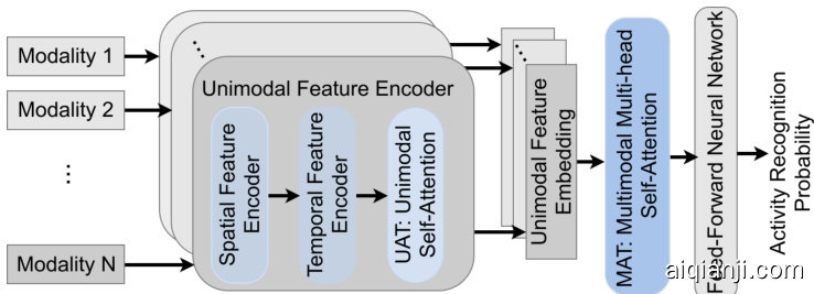 许多研究者已开始在人类活动识别(HAR)中采用注意力机制 [17][18]。例如Xiang等人提出了一种多模态视频分类网络,通过基于注意力的时空特征编码器来推断特定模态的特征表示 [18]。作者探索了多种多模态特征融合方法(特征拼接、LSTM融合、注意力融合和概率融合),发现拼接特征在其他融合方法中表现最佳。目前大多数HAR方法使用基于注意力的方法来编码单模态特征,但尚未将注意力机制用于从多模态中提取和融合显著特征。