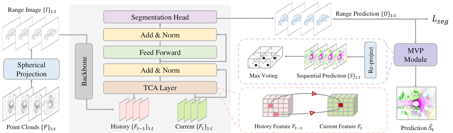 The overview of our proposed network is illustrated in Fig. 2. Our proposed network takes as input a point cloud $P$ comprising $N$ points represented by 3D coordinates $x,y,z$ , and intensity $i$ . The point cloud is projected onto a range image $I$ of size $H\times W\times5$ using a spherical projection technique employed in previous works [32, 46]. Here, $H$ and $W$ represent the height and width of the image, and the last dimension includes coordinates $(x,y,z)$ , range $r=\sqrt{x^{2}+y^{2}+z^{2}}$ , and intensity $i$ . Next, we feed the range image into our backbone model to obtain multi-scale features $F$ with resolutions ${1,1/2,1/4,1/8}$ . We employ a Temporal Cross-Attention (TCA) layer to integrate spatial features from the history frame. The aggregated features are then fed to the segmentation head, which predicts the range-image-based semantic segmentation logits $O$ . For inference, we re-project the 2D semantic segmentation prediction to a 3D point-wise prediction $S$ . Subsequently, we propose a Max-Voting-based Post-processing (MVP) strategy to refine the current prediction $S_{t}$ by aggregating pre- vious predictions. We describe the key components of our network in the following sections.