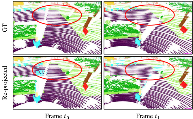 Fig. 1 offers an illustration of this problem. Imagine that the LiDAR sensor is situated at the bottom-left of each range image. Close to the sensor, there is a billboard colored blue, and farther away is the terrain, displayed in purple. At time $t_{0}$ , as marked by the red circle, even though the terrain and billboard are physically separate objects, some points on the terrain are incorrectly labeled as part of the billboard. This happens because these points, due to their similar angles relative to the LiDAR sensor, get projected onto the same pixel in the range image. Upon the movement of the car and the consequent change in the sensor’s field of view, we see a different scenario at time $t_{1}$ : the previously mislabeled terrain points are now accurately classified. This improvement is attributed to the fact that their angular positions relative to the LiDAR sensor have changed, allowing them to avoid being hidden or masked by the billboard. This example illustrates how the dynamic movement affects LiDAR-based semantic segmentation and underscores the possibility of developing reliable and adaptable methods to tackle the “many-to-one” issue in this context.