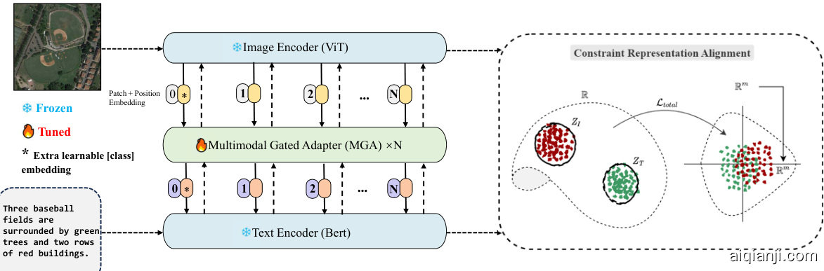 在先天失明者的大脑中,视觉皮层的部分区域能够承担语言处理功能 (Bedny et al., 2011)。与此同时,典型人类大脑皮层中的多个小区域——如角回 (Angular Gyrus) 和视觉词形区 (Visual Word Form Area, VWFA)——充当着视觉-语言整合处理的枢纽 (Houk & Wise, 1995)。这些区域以层级化方式管理着从低阶到高阶的刺激信息 (Chen et al., 2019)。受此自然现象启发,我们提出了"高效遥感与协调迁移学习及模态对齐方法 (Harmonized Transfer Learning and Modality Alignment, HarMA)"。具体而言,我们仿照人脑信息处理方式,设计了一个包含微型适配器 (mini-adapter) 的层级化多模态适配框架。该框架模拟了人脑利用共享微型区域来处理源自视觉与语言刺激的神经脉冲策略,通过层级化共享多个微型适配器,实现了从低阶到高阶的视觉-语言语义空间建模。最后,我们引入新的目标函数来缓解同模态内部特征严重聚集的问题。得益于其简洁性,该方法可轻松集成到几乎所有现有多模态框架中。