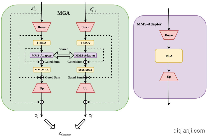 在此模块中,提取的特征$z_{I}$和$z_{T}$首先被投影到低维嵌入空间。通过非线性激活和随后的I-MSA处理,不同特征$z_{I}$ $(z_{T})$在特征表达上得到进一步增强。I-MSA与后续的MM-MSA共享参数。这些特征随后被输入到我们设计的Multimodal Sub-Adapter (MMS-Adapter)中进行进一步交互,该模块结构如[图3]右侧所示。