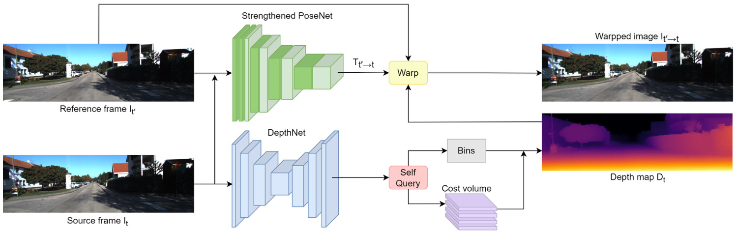 Our method comprises two primary components: DepthNet for depth prediction and PoseNet for relative pose estimation.