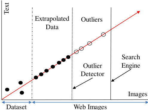 图 1: 数据线性外推示意图。我们使用搜索引擎和离群值检测器来确保图像相似性。外推生成的文本-图像对数量远超原始数据集。