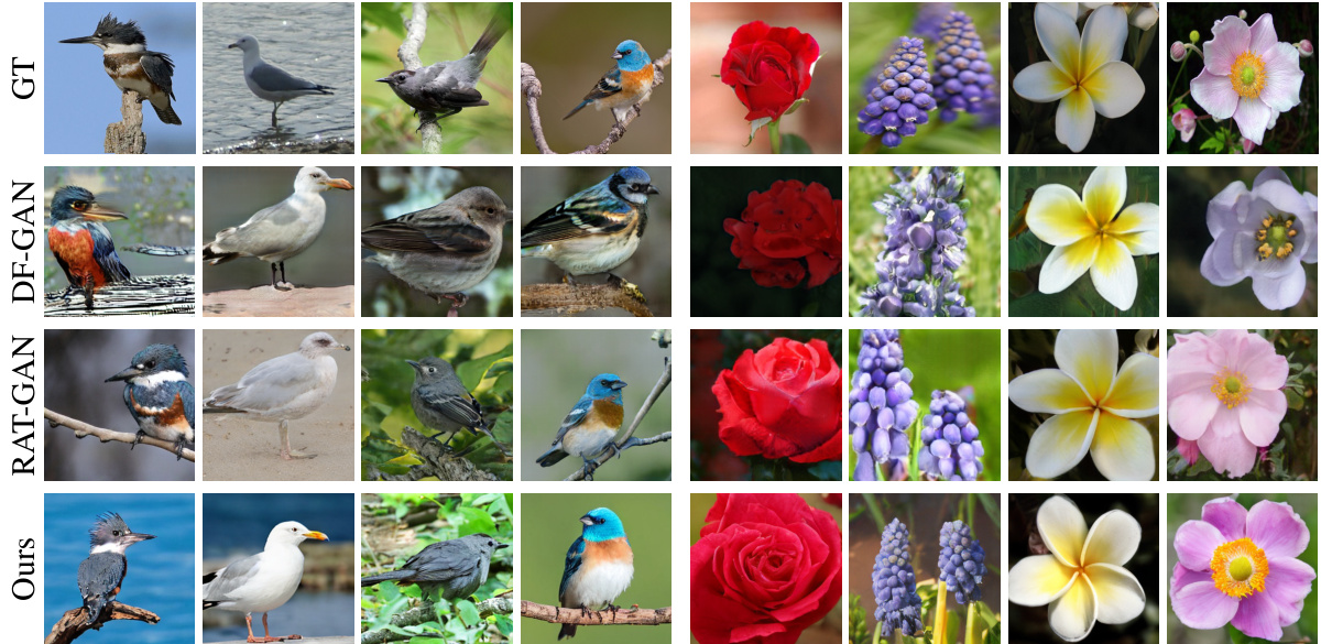 基于GAN的文本到图像模型。文本到图像合成是条件图像合成中的关键任务 (Feng et al., 2022; Tan et al., 2022; Peng et al., 2021; Hou et al., 2022)。(Reed et al., 2016b) 的开创性工作首次使用条件GAN (Mirza & Osindero, 2014) 解决该任务。为更好地将文本信息融入合成过程,DF-GAN (Tao et al., 2022) 提出了一种深度融合方法,在单个模块中采用多重仿射层。与先前方法不同,DF-GAN在保持性能的同时移除了归一化操作,从而降低计算需求并缓解了大批量大小的限制。在DF-GAN基础上,RAT-GAN采用循环神经网络逐步将文本信息整合到合成图像中。GALIP (Tao et al., 2023) 和StyleGAN-T (Sauer et al., 2023) 探索了将GAN模型与Transformer结合用于大规模文本到图像合成的潜力。然而,上述基于GAN的模型往往难以生成高质量图像。