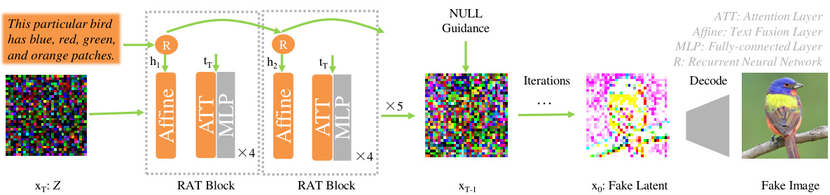 图 2: 采用循环仿射变换和NULL引导的潜在扩散模型用于文本到图像合成。RAT模块通过循环神经网络连接以确保文本信息的全局分配。