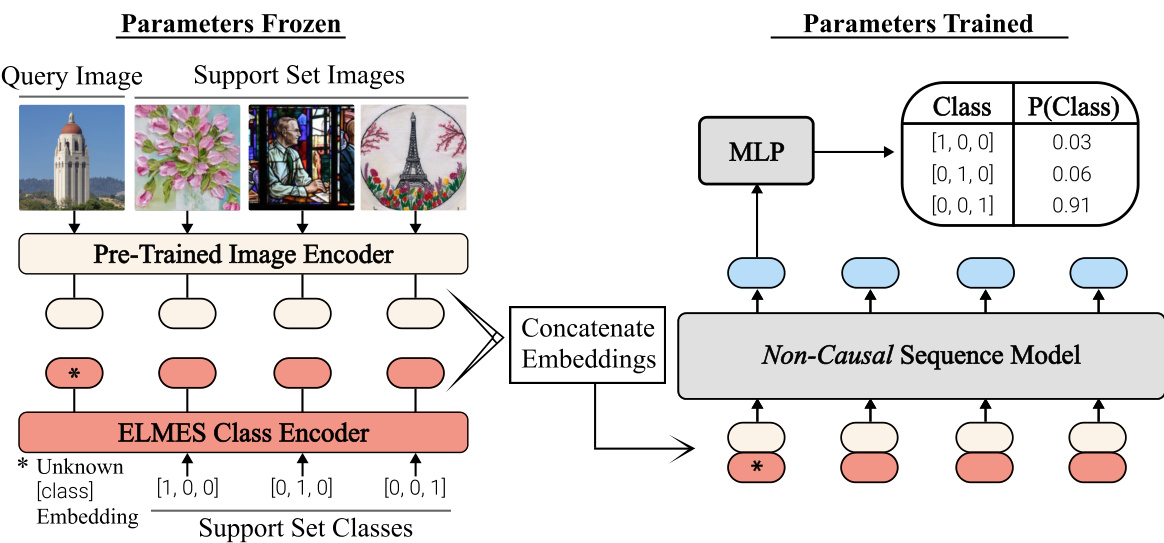 Figure 1: Overview of CAML. Query and support set images are encoded with a pre-trained feature extractor and then concatenated with their corresponding ELMES label embeddings. We feed the resulting sequence of concatenated vectors into a non-casual sequence model and extract the query vector from the output sequence to predict its class.