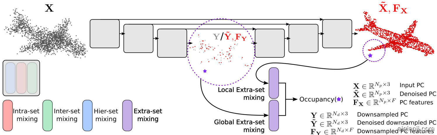 图 2: 概述:我们的方法全程仅使用多层感知机 (MLP) 从含噪输入点云预测隐式形状函数。首先通过U-Net PointMixer [17](灰色框)对输入点云去噪并生成逐点特征。该网络的构建模块结合了3种现有点混合方式,将点云中支撑点的特征池化到点云的其他点。通道混合技术也贯穿整个模型。具体混合层实现细节请参阅Choe等人的工作[17]。我们提出的"额外集混合"(第3.3节)可将特征局部和全局池化到任意外部查询点以估算其占据概率,该混合过程由基于去噪支撑点坐标的相对位置编码引导(见图3)。