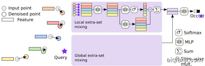 Figure 2. Overview: Our method uses exclusively MLPs from beginning to end to predict an implicit shape function given a noisy input point cloud. First a U-Net PointMixer [17] (Gray boxes) is tasked with denoising the input and producing per point features. The building blocks of this network combine 3 pre-exiting forms of point mixing which pool features from support points in a point cloud into other points of the point cloud. Channel-wise mixing is also used throughout the model as well. We refer the reader to the work of Choe et al. [17] for a detailed description on these preexisting mixing layers. We introduce ”Extra-set mixing” (Section 3.3), which we use to pool features both locally and globally onto any external query point to estimate its occupancy. This mixing is guided by relative positional encoding using the denoised support point coordinates (See Figure 3).