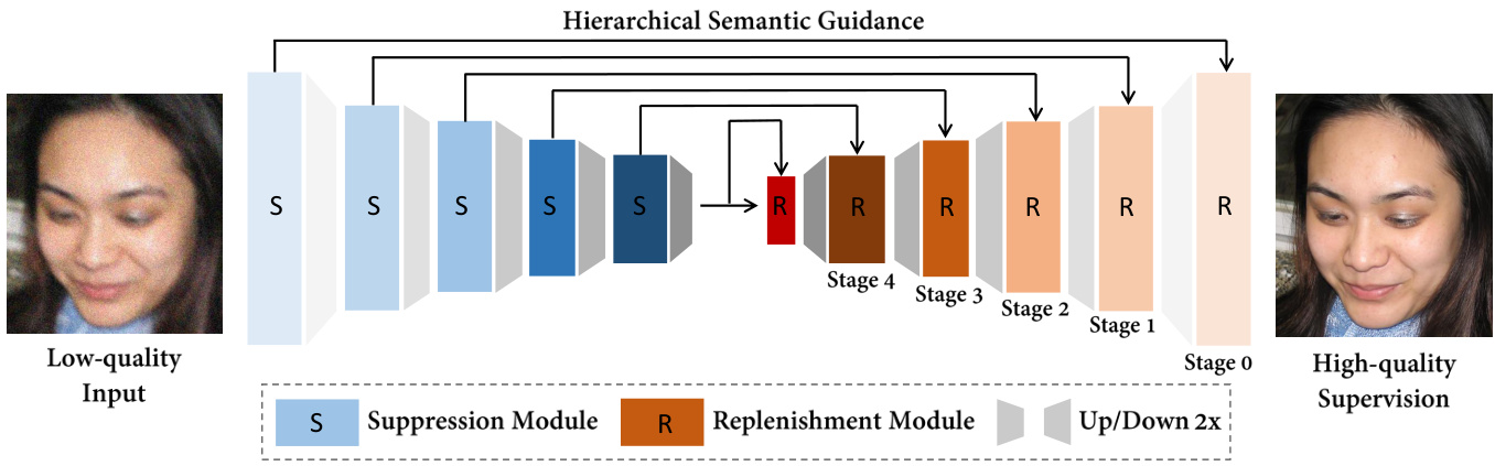 With the single dominated type of degradation, existing methods are devoted to fit an inverse transformation to recover the image content. When it comes to real-world scenes, the low-quality facial images usually contain unidentified heterogeneous degradation, necessitating a unified solution that can simultaneously address common degradation s without prior knowledge. Given a severely degraded facial image, the renovation can be reasonably decomposed into two steps, 1) suppressing the impact of degradation s and extracting robust semantic features; 2) replenishing fine details in a multi-stage fashion based on extracted semantic guidance. Generally speaking, a facial image can be decomposed into semantic hierarchies, such as structures, textures, and colors, which can be captured within different receptive fields [? ]. Also, noise and artifacts need to be adaptively identified and suppressed according to different scale information. This motivates the design of HiFaceGAN, a multi-stage renovation framework consisting of several nested collaborative suppression and replenishment(CSR) units that is capable of resolving all types of degradation in a unified manner. Implementation details will be introduced in the following section.