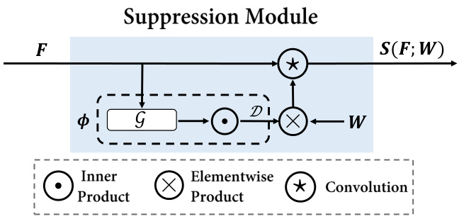 where $i,j$ are 2D spatial coordinates, $\Omega(i)$ is the sliding window centering at $i,\Delta j i$ is the offset between $j$ and $i$ that is used for indexing elements in 𝑊 . The key observation from Eqn. (1) is that the conventional CNN layer shares the same kernel weights over the entire image, making the feature extraction pipeline contentagnostic. In other words, both the image content and degradation artifacts will be treated in an equal manner and aggregated into the final feature representation, with potentially negative impacts to the renovated image. Therefore, it is highly desirable to select and aggregate informative features with content-adaptive filters, such as LIP [10] or PAC [51]. In this work, we implement the suppression module as shown in Fig. 4 to replace the conventional convolution operation in Eqn. (1), which helps select informative feature responses and filter out degradation artifacts through adaptive kernels. Mathematically,