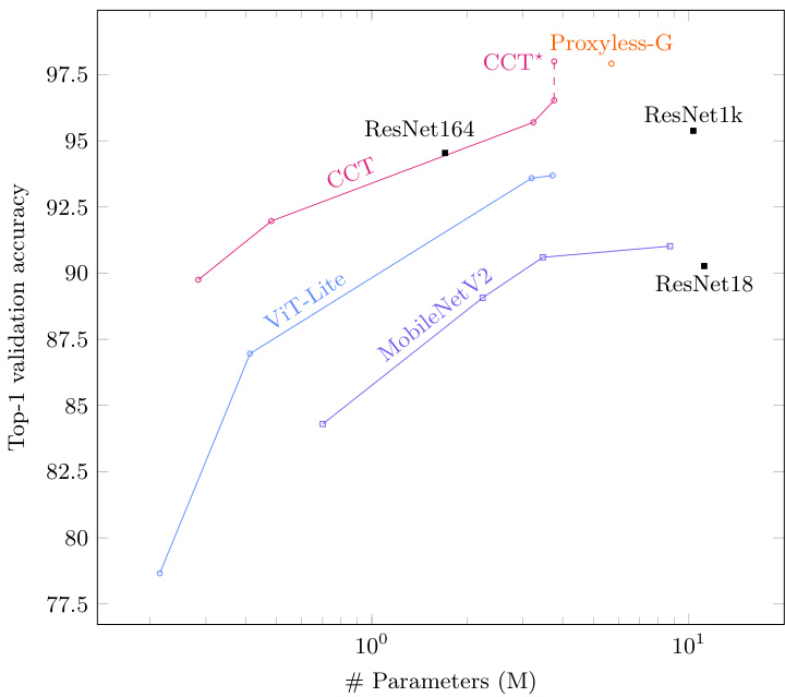 Figure 3: CIFAR-10 accuracy vs. model size (sizes $<12\mathbf{M})$ . $\mathrm{CCT^{\star}}$ was trained longer.