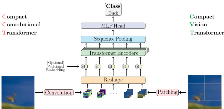 Figure 1: Overview of CVT (right), the basic compact transformer, and CCT (left), the convolutional variant of our compact transformer models. CCT can be quickly trained from scratch on small datasets, while achieving high accuracy (in under 30 minutes one can get $90%$ on an NVIDIA 2080Ti GPU or $80%$ on an AMD 5900X CPU on CIFAR-10 dataset).