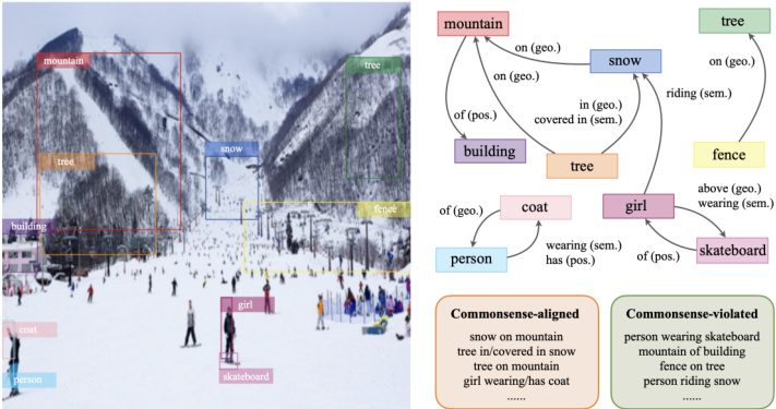 图 1: 示例场景图。每条边代表在几何、所属或语义超类别下预测的关系,可以是符合常识或违背常识的。