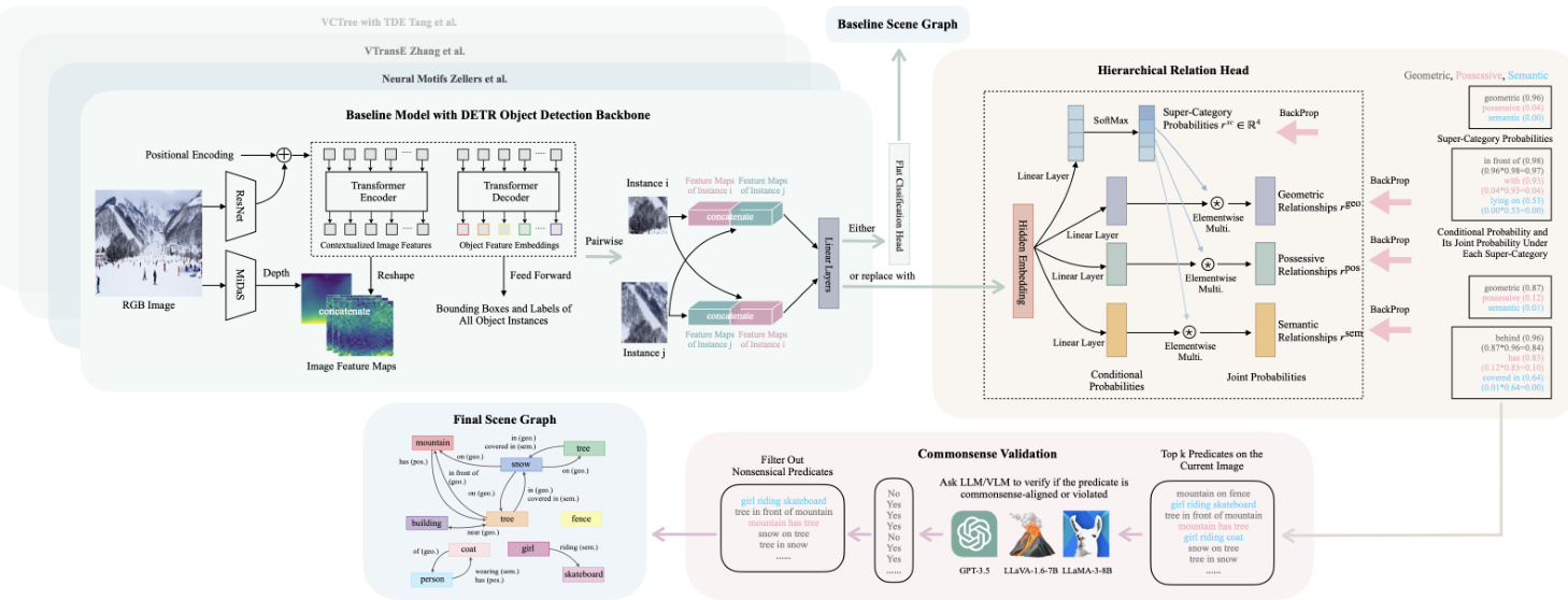 图 2: 本图展示了HIERCOM的总体框架。该系统的核心组件是分层关系头(hierarchical relation head)和常识验证流程(commonsense validation pipeline),这两个模块均采用与模型无关的即插即用设计,可适配各类配备传统扁平分类头的场景图生成基线模型。具体而言,分层关系头用于替代原有扁平分类层,通过联合预测关系超类别及各超类别下的细粒度关系实现层级化建模。图中同时展示了基线场景图生成模型的工作流程:以RGB图像为输入,辅以估计的深度图;通过DETR目标检测器生成特征图、物体标签及边界框;每对实例的关系预测分两次独立计算(以处理方向性关系)——先假设一个实例为主语再假设另一个实例为主语。最后,常识验证流程调用轻量化的大语言模型或视觉语言模型,过滤违反常识的谓词,从而优化最终场景图使其包含更多符合常识的谓词。