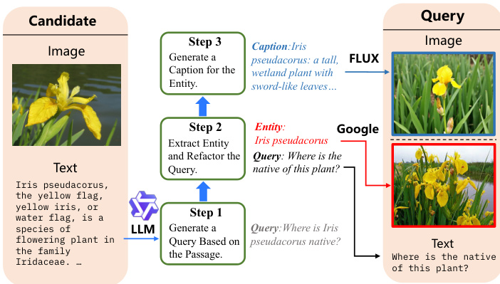 EVQA [46] 该数据集与INFOSEEK类似, 关键区别在于EVQA的检索目标是完整的维基百科段落, 最大长度可达数千个token. 我们使用3,743个样本进行评估, 消除了原始测试集中存在的多跳问题. 我们从原始数据集中选取维基百科段落作为候选, 并补充了图像. 当段落本身包含图像时我们采用原生图像, 否则使用文章首张图像因其通常具有代表性.