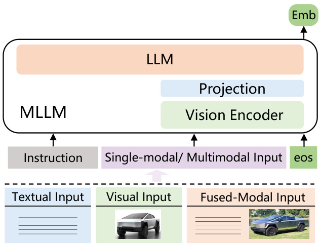 图 2: GME 模型架构。Emb 表示输入内容的嵌入。