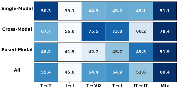 To evaluate the effectiveness of our framework, we compile a comprehensive UMR Benchmark, namely UMRB. This benchmark encompasses tasks from widely recognized retrieval benchmarks in text [55], multimodal [66], and visual document retrieval [12], as well as our newly processed fused-modal retrieval data. We build our models on top of the strong Qwen2-VL series MLLMs [65] and train them on our constructed dataset. Experimental results demonstrate that our model achieves state-of-the-art performance on UMRB. Additionally, we perform in-depth analyses on model scaling, training strategies, and ablation of our synthetic data. Our key contributions are: