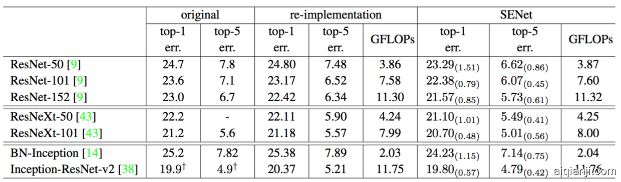 表2。ImageNet验证集上的单裁剪图像错误率(%)和复杂度比较。original列是指原始论文中报告的结果。为了进行公平比较,我们重新训练了基准模型,并在re-implementation列中报告分数。SENet列是指已添加SE块后对应的架构。括号内的数字表示与重新实现的基准数据相比的性能改善。†表示该模型已经在验证集的非黑名单子集上进行了评估(在[38]中有更详细的讨论),这可能稍微改善结果。