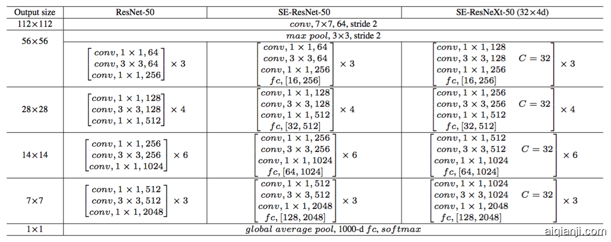 Table 1. (Left) ResNet-50. (Middle) SE-ResNet-50. (Right) SE-ResNeXt-50 with a 32×4d32×4d template. The shapes and operations with specific parameter settings of a residual building block are listed inside the brackets and the number of stacked blocks in a stage is presented outside. The inner brackets following by fc indicates the output dimension of the two fully connected layers in a SE-module.