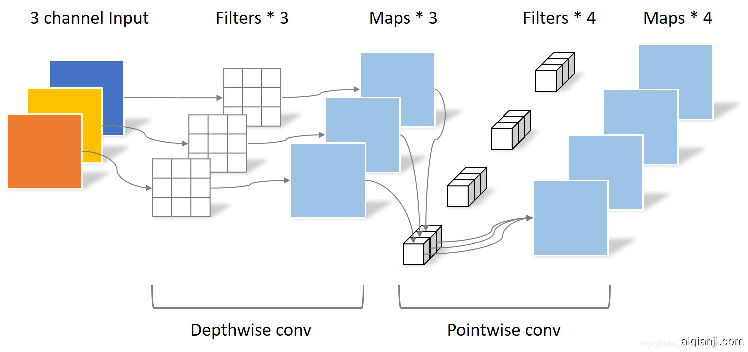 深度卷积相对于标准卷积非常有效。但是它只对输入通道进行滤波,它不会组合它们以创建新功能。因此,需要一种附加层,其通过$ 1 \times 1  $卷积需要计算深度卷积的输出的线性组合,以便生成这些新功能。