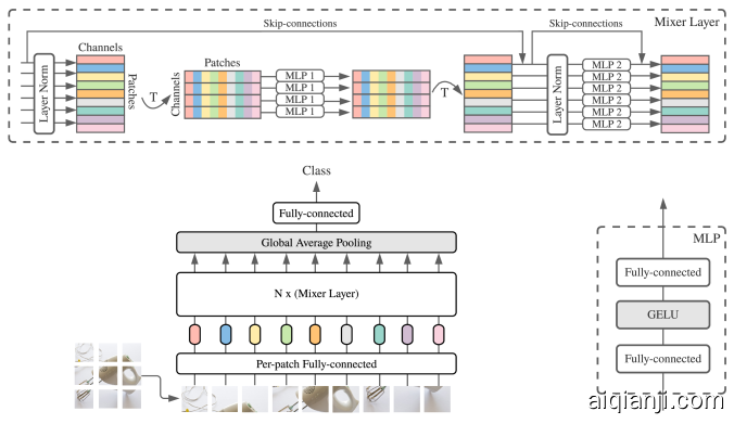 图1: MLP-Mixer由每个修补程序的线性嵌入,混合器层和一个分类器头组成。混合器层包含一个令牌混合MLP和一个通道混合MLP,每个都包含两个完全连接的层和一个GELU非线性。其他组件包括:跳过连接,丢失,通道上的图层规范以及线性分类器头。
