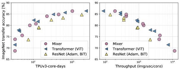 As the pre-training dataset grows, Mixer’s performance steadily improves. Remarkably, Mixer-H/14 pre-trained on JFT-300M and fine-tuned at 224 resolution is only 0.3% behind ViT-H/14 on ImageNet whilst running 2.2 times faster. Figure 3 clearly demonstrates that although Mixer is slightly below the frontier on the lower end of model scales, it sits confidently on the frontier at the high end.